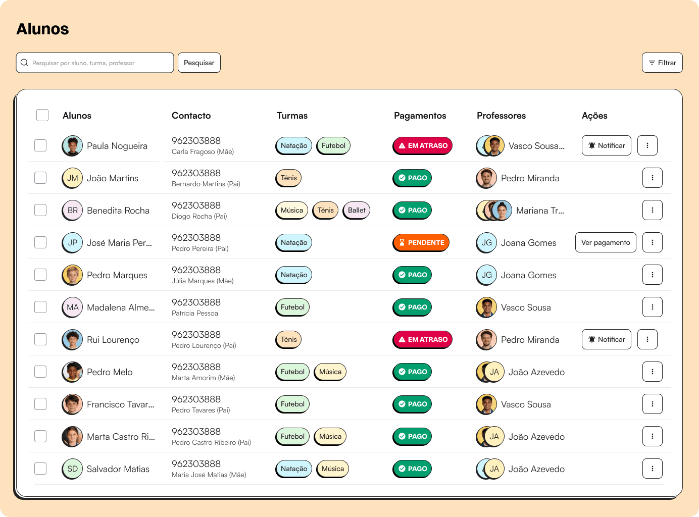 Vê os alunos, presenças, documentos, pagamentos e turmas de forma fácil e rápida